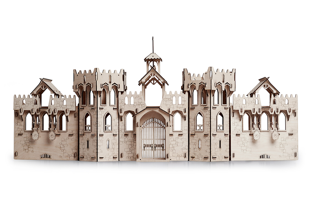 Деревянный конструктор состоит из двух башен, центральная стена, у которой есть шлавные ворота и две защитные стены со стрелковыми вышками. С одной стороны башни закрыты, с другой стороны есть лестницы, по которым можно подняться.