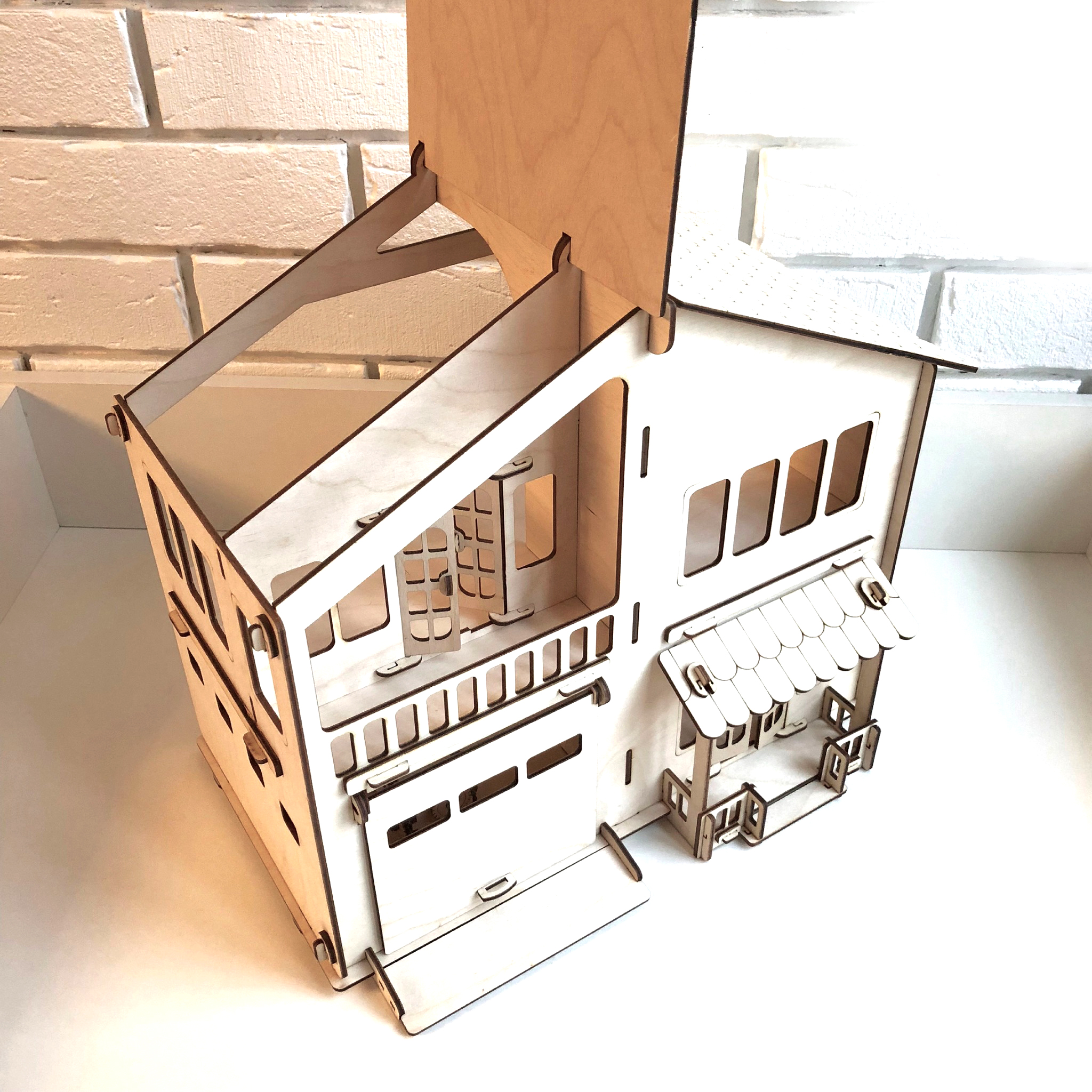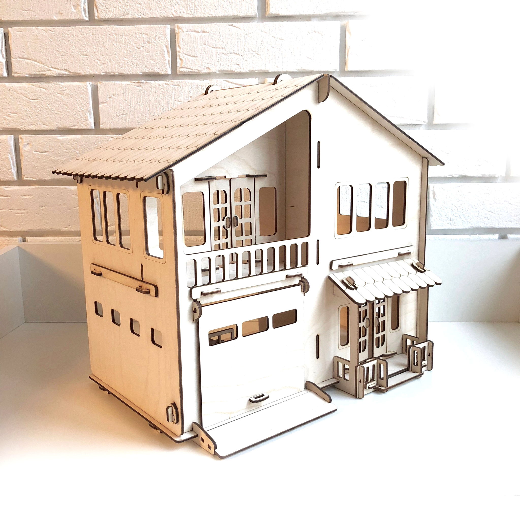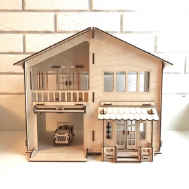 Особенностью данного дома для кукол является наличие гаража с откидными воротами. Кукольный домик вмещает в себя 2-3 набора мебели. Крыша поднимется, в гараж можно припарковать машинку из фанеры. Домик подходит как девочкам, так и мальчикам.