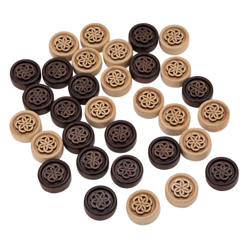 На их изготовление идет ореховая древесина, которая славится своими положительными качествами. В первую очередь – высокая прочность. Она не позволит поломаться фишке, во время быстрой игры, конечно, если не прикладывать излишней силы. Второе – долгий срок эксплуатации. Если не мочить в воде и не оставлять на палящем солнце, служить будет практически бесконечно. Сверху дерево покрывается лаком для придания блеска.