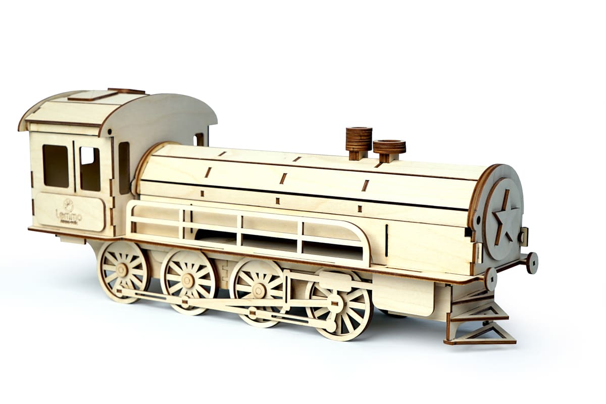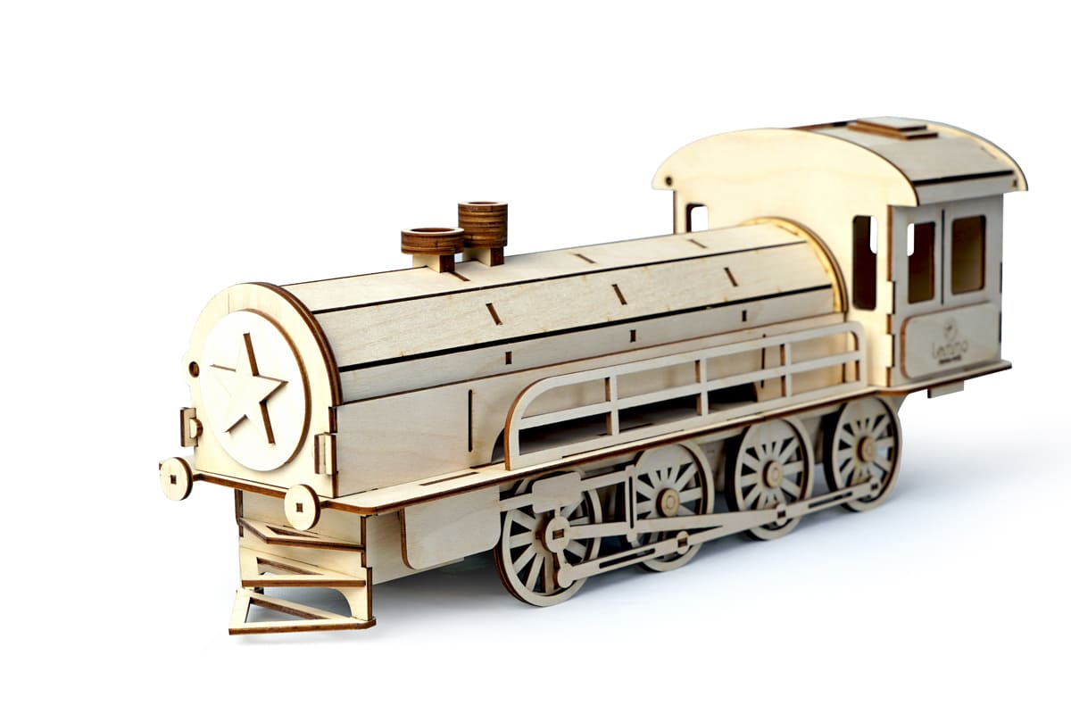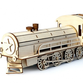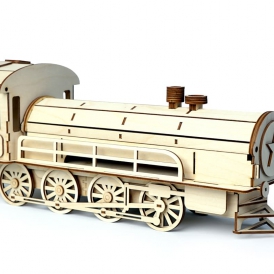 У собранной модели конструктора из фанеры открывается отсек основания и крышка кабины машиниста. Можно использовать, как пенал или использовать, как подарочную коробку и подарить коллеге или начальнику. Такой предмет интерьера всегда привлечет внимание гостей.