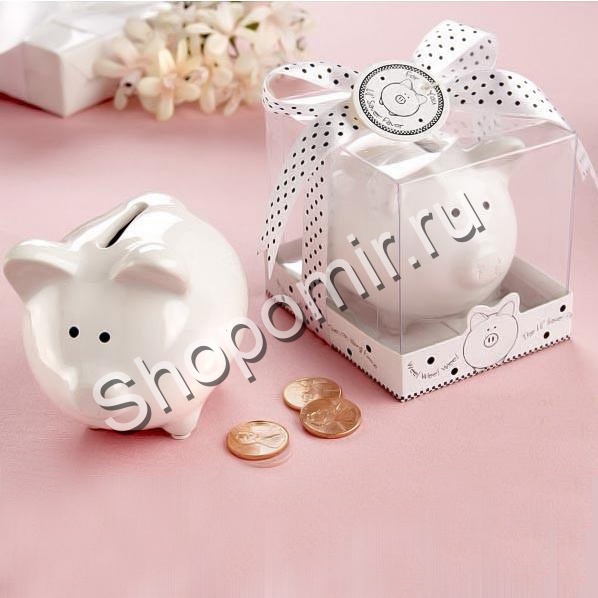Копилка в виде миниатюрной свинки. Упакована в праздничную упаковку.