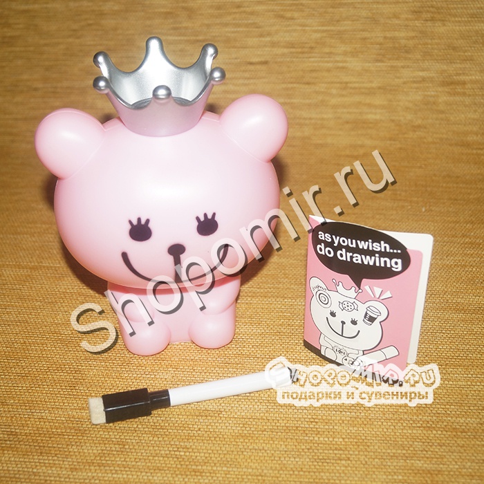 Изделие имеет вполне узнаваемую конфигурацию медведя бледно розового оттенка. Непомерно большая голова увенчана серебристой короной, а на мордочке отмечено веселое выражение. В чем же состоит секрет копилки «Нарисуй мишку»? Ответ таится в названии изделия и прилагаемом к нему маркере. Такому подарку малыш будет безмерно рад, к тому же разрисованная по его вкусу копилка станет приятным напоминанием о детстве на долгие годы.