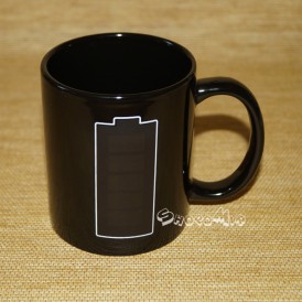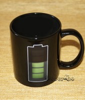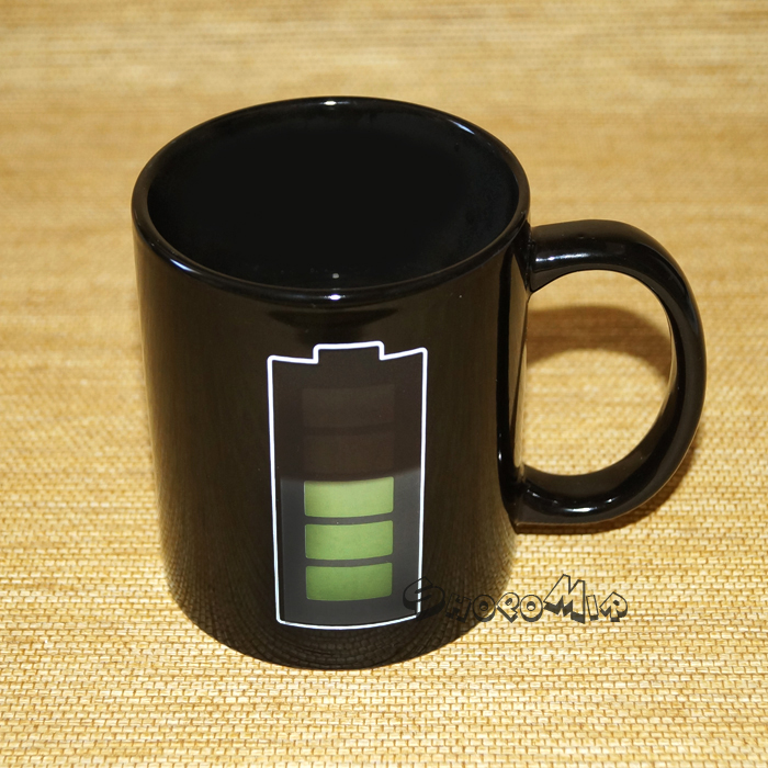 На боку кружки удобной конфигурации красуется изображение обычной батарейки. Четкие контуры, постепенно наполняющиеся зеленым свечением, выступают нескромным намеком на то, что жидкость в этом сосуде обладает поистине чудодейственными свойствами.