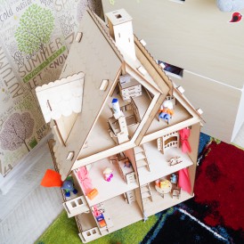 Трехэтажный дом для кукол состоит из шести комнат: зал, ванная, спальня, прихожая, туалет и детская. Резная крыша, лестница на каждый этаж, гардины и занавески в комплекте. Домик не раскрашен, пусть ваш ребенок будет дизайнером и придумает все сам. А мама сошьет самый настоящий текстиль для домика, но только в миниатюре.