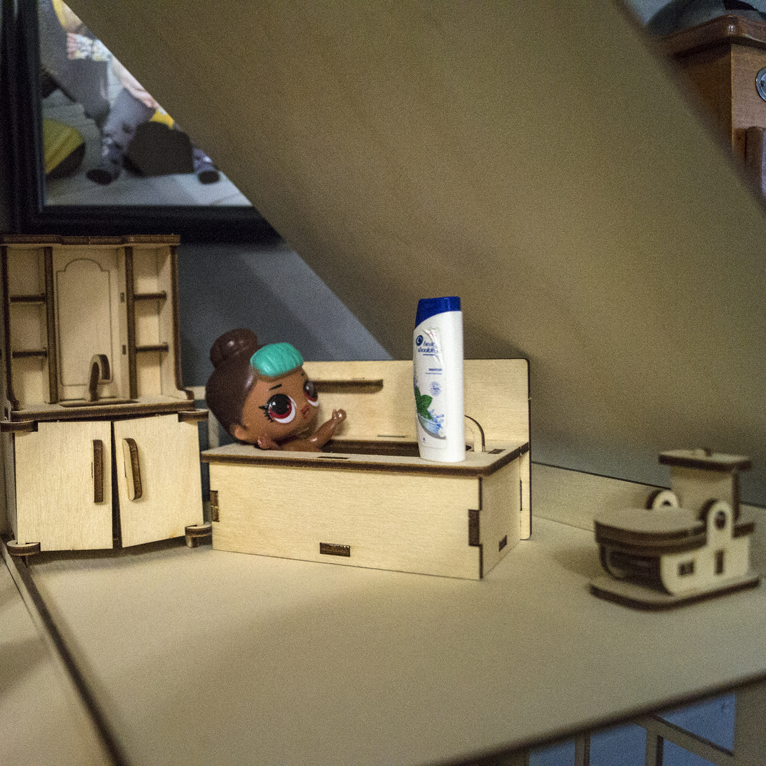 Дом для кукол из фанеры состоит из 2-х этажей и мансарды, даже открытая пристройка есть у дома, куда сверху можно разместить уличный бассейн, а внизу использовать в качестве гаража для машин. Дом открытый с одной стороны.