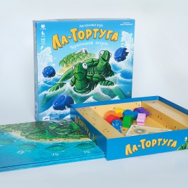 Ла Тортуга. Черепаший Остров – прекрасная детская настольная игра, красочная, яркая и, безусловно, интересная. Игра состоит из большого игрового поля в виде острова Ла Тортуга посредине океана, семь фишек в виде маленьких цветных черепашек и трех игральных кубиков.