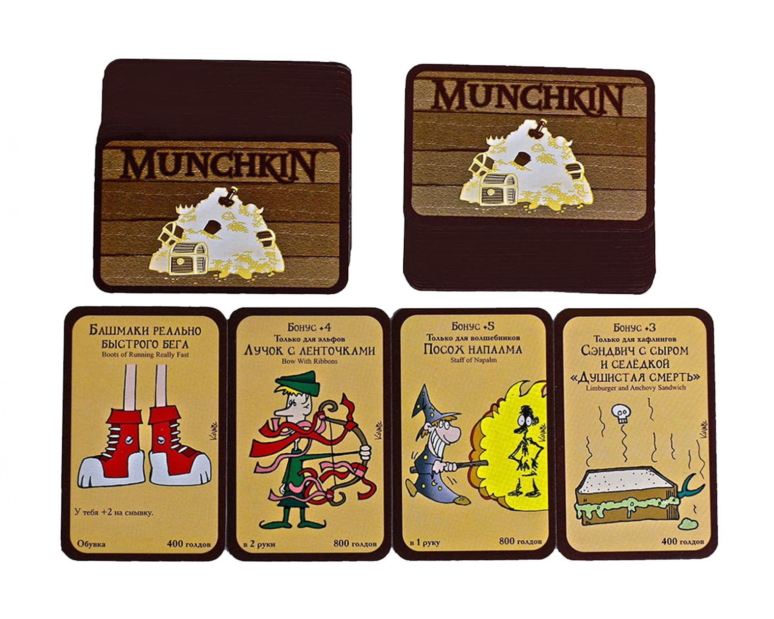 В коробке вы найдёте 168 карт дверей и сокровищ, кубик для смывки и правила выживания в подземелье. Вот всё, что необходимо настоящему манчкину!