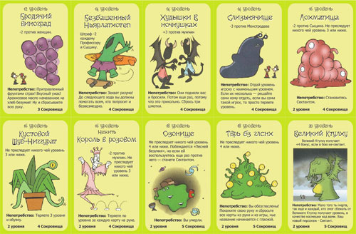 Манчкин. Ктулху – самостоятельная версия безумно популярной игры от Стива Джексона. Механика и правила пришли из классического манчкина: за каждой дверью игроков ждёт какое-то приключение. Это может быть класс, проклятие или монстр. С помощью шмоток, силы своих уровней или помощи других игроков, манчкины преодолевают препятствия или терпят непотребства. Манчкин манчкину друг ровно до того момента, пока ему это выгодно. В следующий момент он уже может воткнуть проклятие вам в спину или направить к вам дополнительного монстра. И всё это сопровождается прекрасными иллюстрациями и ноткой убойного юмора в стиле Манчкин!