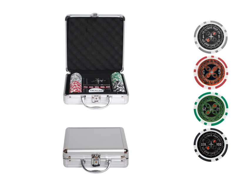 Оптимальное сочетание цены и качества сошлись в покерном наборе Ultimate на 100 фишек. Такой набор для игры в покер идеально подойдёт для того, чтобы за круглым столом собрать 3-4 человека. Фишка дилера, 100 фишек различных номиналов, 5 игральных костей и 2 колоды 100% пластиковых карт по 54 листа - всё это лежит в надёжном стальном кейсе, который позволяет легко транспортировать покерный набор.