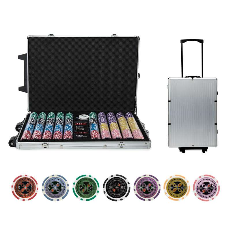 Покерный набор Ultimate на 1000 фишек – это выбор человека с отменным вкусом! Вы также можете преподнести данный набор для игры в покер в качестве подарка, и быть уверенными, что Ваш презент оценят по достоинству. В стальном кейсе с ключами находится всё необходимое для качественно проведённой партии: фишка дилера, 1000 красивых фишек различных номиналов, 3 колоды 100% пластиковых карт и 5 игральных костей. Такой набор для покера очень выгоден, ведь современный кейс оснащён колёсиками и удобной ручкой. Благодаря такой системе Вы всегда сможете покерный набор брать с собой.