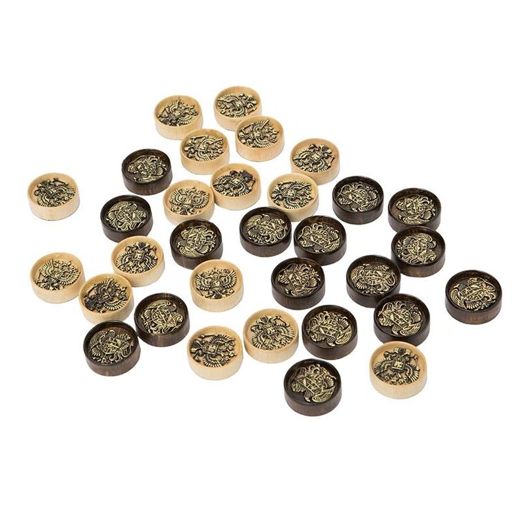 Фишки выполнены очень точно – идеальный круг, без каких-либо дефектов и заусенец. Для придания блеска, древесина покрывается сверху несколькими слоями лака. Дополнительно он защищает при попадании воды, не давая ей впитываться в сам материал. На верхней части нанесен рисунок из бронзы, причем с такой детализацией, будто здесь использован лазерный резак, а не человеческие руки. Нижняя грань покрыта тканью, чтобы при передвижении доска не царапалась и улучшилось скольжение.