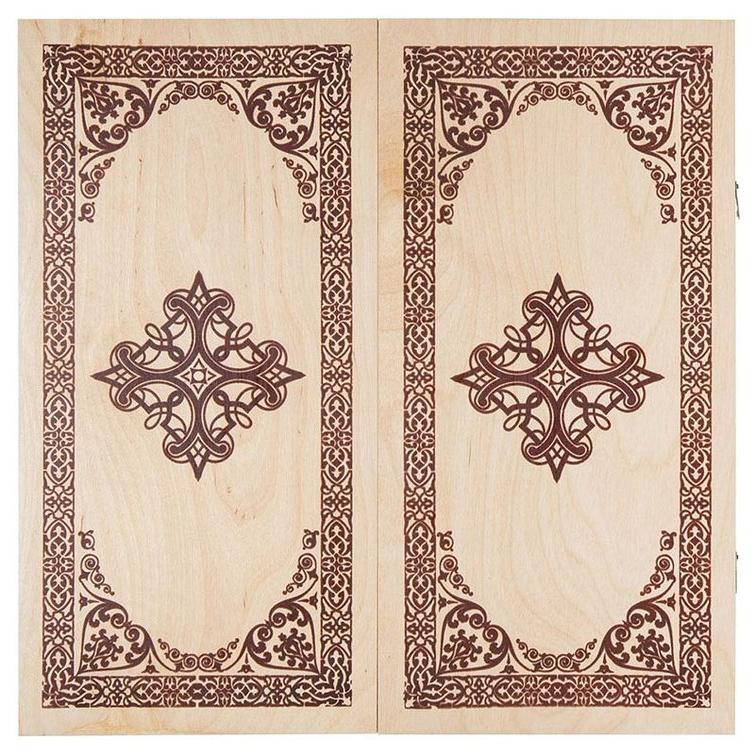 С обеих сторон доски нанесен узорчатый рисунок, который точно не сотрется на всем протяжении использования. Фишки пластиковые, умеренно прочные и прослужат долгое время, как и комплектные игральные кости. Створки скреплены между собой петлями из металла, а для закрытия используются два крючка. Все это, вкупе с весом всего лишь в 600 грамм, позволяет брать доску с собой в любое место.