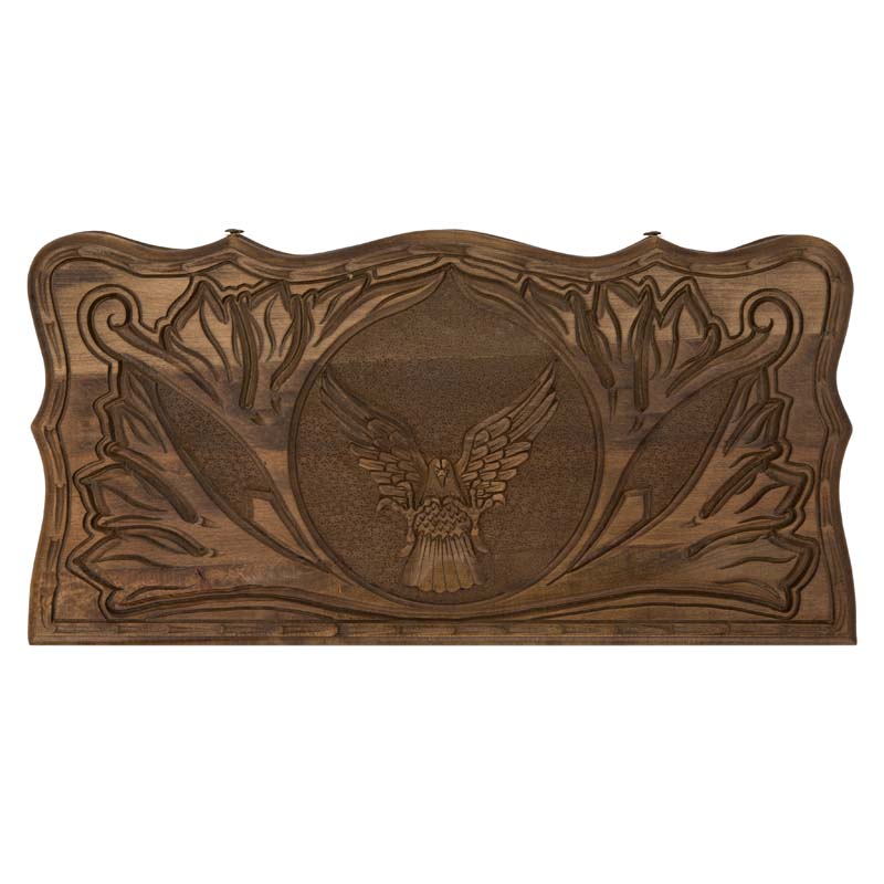 Внешняя лицевая сторона доски украшена изображением ястреба, готовящегося к нападению на жертву. Тыльная внешняя сторона сделана под игровое поле для шахмат. Каждая деталь, высеченная мастером, впечатляет своей реалистичностью и детализацией. Сама доска, а также игровые фишки вскрыты несколькими слоями лака, который не только придает дополнительный декоративный эффект, элегантный блеск, но и делает изделие более долговечным и устойчивым к механическим повреждениям.