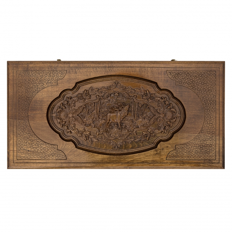 При создании своих шедевров, мастер использует ореховую древесину. Одна из ее особенностей в том, что она легко поддается обработке и позволяет создавать узоры с очень маленькими деталями. В этом случае используется изображение лося, гуляющего по лесу в поисках пищи. По краям также имеются рисунки в виде маленьких цветов. Для того чтобы можно было отвлечься от напряженных партий в нарды, предусмотрено отдельное поле 8х8. С помощью комплектных фишек на нем можно быть сыграть пару игр в шашки.