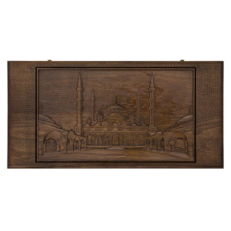 На поверхности одной из створок вырезана мечеть из города Грозного, поэтому и было дано такое название. Все сделано на очень хорошем уровне – каждая деталь подчеркнута и заметна. Вторая створка снабжена полем для игры в шашки, чтобы можно было отвлечься и расслабиться между партиями. Створки скрепляются между собой петлями из бронзы, отличающимися мягкостью и долговечностью. Из этого же сделаны и крючки. Внутренние поверхности украшены небольшим узорчатым рисунком по центру, а каждая ячейка дополнительно покрыта орнаментом.