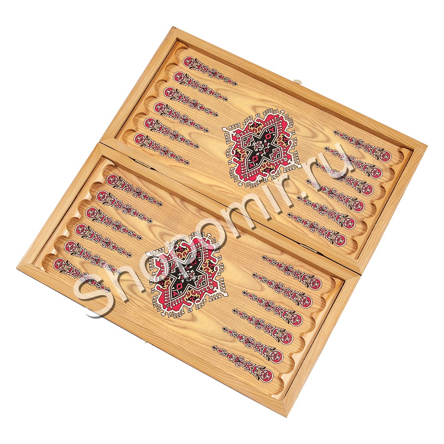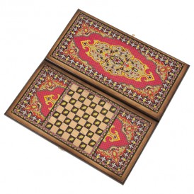 Нарды “Сирия Красные” средние украшены восточным геометрическим орнаментом, с крупным узором в центральной части и обрамлением по периметру доски. Преобладающий цвет композиции - красный, который считается цветом жизни и любви.