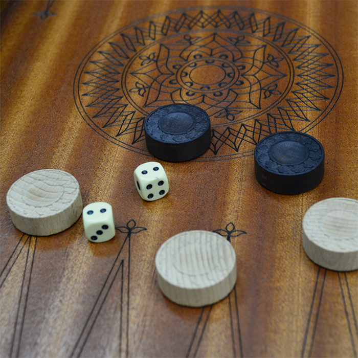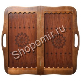 Складная доска нард с ручкой изготовлена из дерева, снаружи отделка тисненой кожей темно-коричневого цвета - имитацией кожи питона, Поле доски украшено по центру восточным выжженным рисунком. Фишки резные.