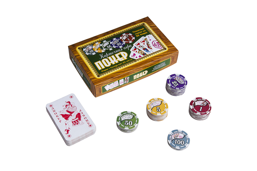 В комплекте нет ничего лишнего: колода карт из 54 листов и пять видов фишек разного цвета с указанным на них номиналом. Размер картонной коробки всего 18 сантиметров, а вес - меньше 200 граммов. Такой набор легко поместиться в любую походную сумку и не создаст лишней тяжести.