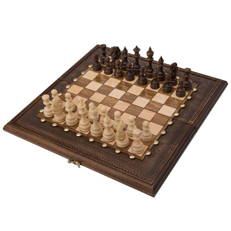 Доска среднего размера, выполненная из высококачественной натуральной древесины ореха, по периметру украшена бронзовыми вставками. Из бронзы также выполнены петли и замок, благодаря чему изделие долговечно и способно выдерживать частую эксплуатацию – набор можно брать с собой, а также использовать в качестве игры для домашнего досуга. Кроме того, верхнюю часть доски украшает резной рельефный узор, которым окантовано шахматное поле. Обратная сторона складной доски размечена под поле для игры в нарды.