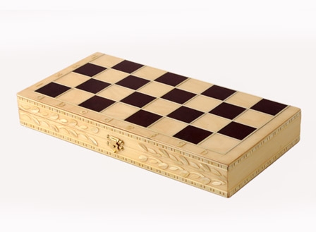 Для производства данного экземпляра использована береза, древесина которой отличается высокой прочностью и долгим сроком службы. Но отличительной стороной тут является внешнее оформление, чем она и выделяется на фоне других шахмат обиходных. В первую очередь, это касается боковых граней доски, где вырезано что-то наподобие лаврового венка. Далее стоит обратить внимание на фигуры, форма которых осталась стандартной, но вот добавление белой каймы смотрится очень кстати. Особенно это заметно на черном цвете, создающим особенный контраст. Крючок для закрывания тоже стал необычным и фигурным, что ничуть не сказалось на его функциональности.