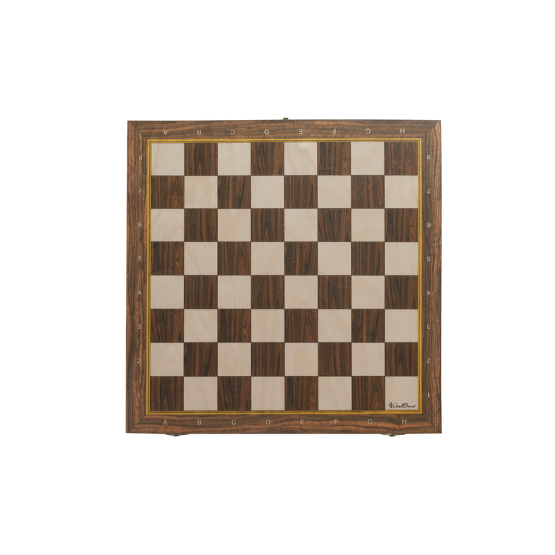 Доска и фигуры выполнены из массива бука. Структура дерева хорошо просматривается на клетках игрового поля и выполняет роль декоративного элемента. Поверхность покрыта специальным лаком, который защитит её от царапин и создаст идеальное скольжение фигур по полю.