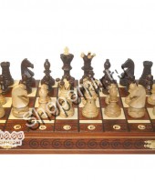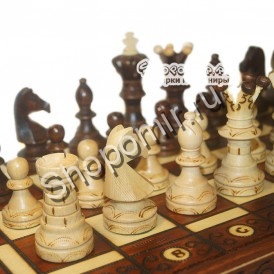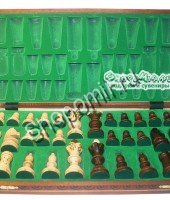 Материал: груша, берёза и клен. Высота короля - 11 см. Высота пешки - 3,2см. Шахматная доска в разложенном виде: 55х55х3 см Клетка на поле - 5х5 см |